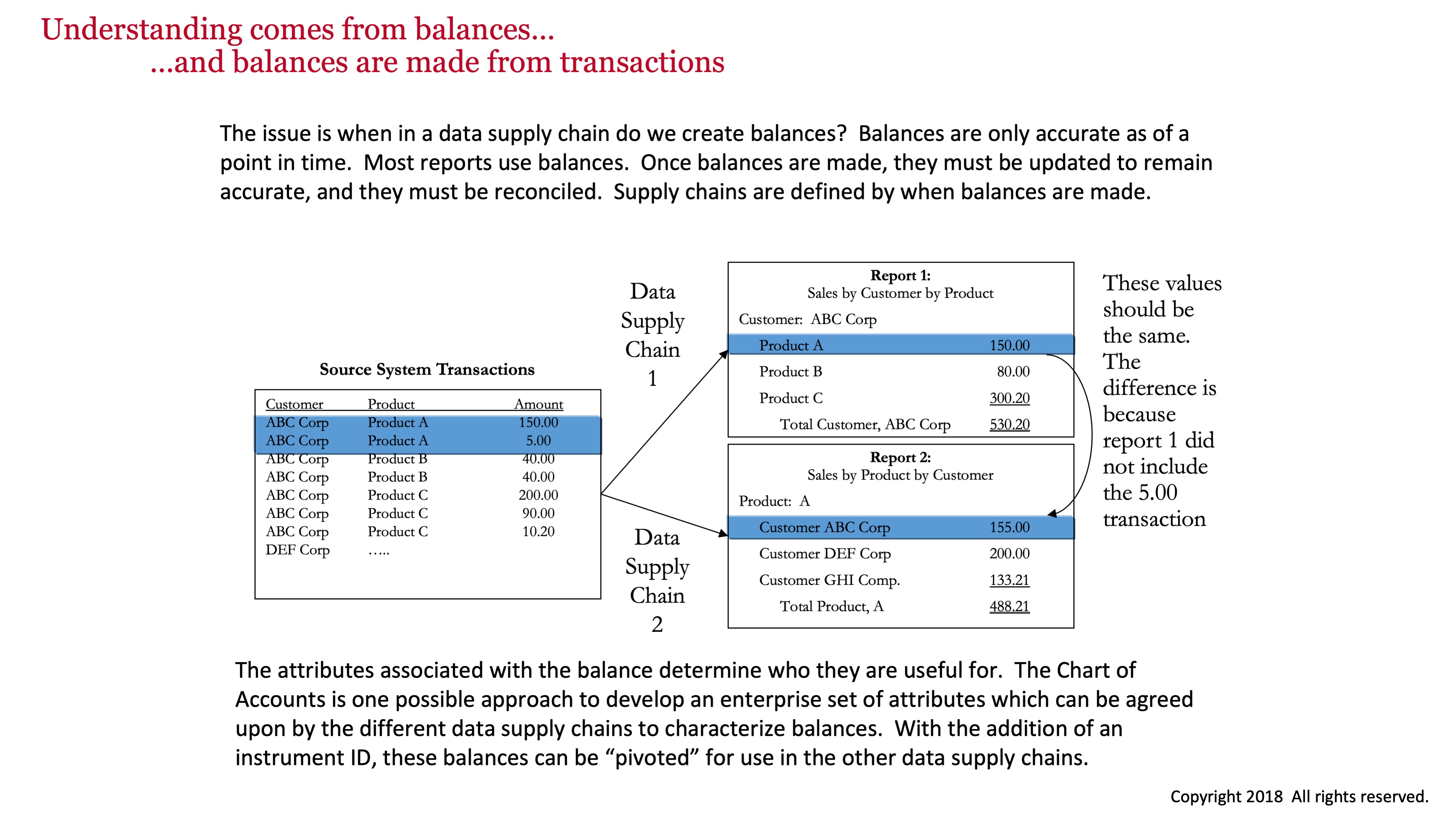 The following charts show the relationship between transactions and balances, and the impact upon analytical processes of using each. They also show how the production of balances (typically in an existing Data Supply Chain) affects the daily Financial Cycle of almost all organizations.